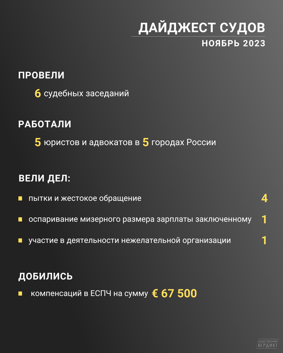 ЕСПЧ вынес в ноябре несколько постановлений по жалобам россиян, чьи интересы представлял «Общественный вердикт». Жалобы касались пыток и жестокого обращения в полиции, бесчеловечных условий содержания, а также преследования за участие в мирных акциях протеста.