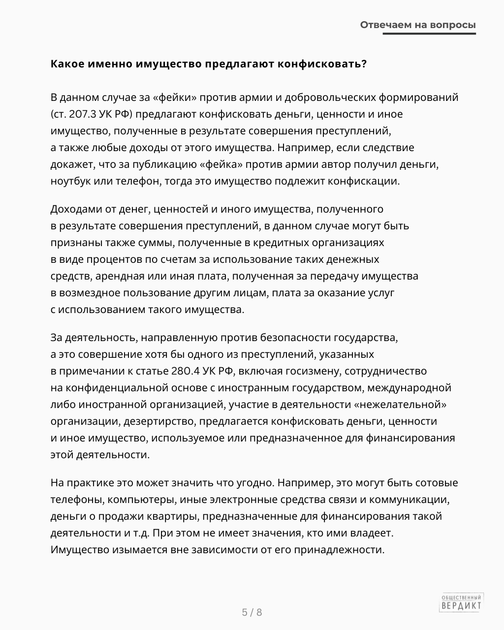 Отвечаем на вопросы о новом законопроекте о конфискации имущества осужденных по статье «о фейках» и не только