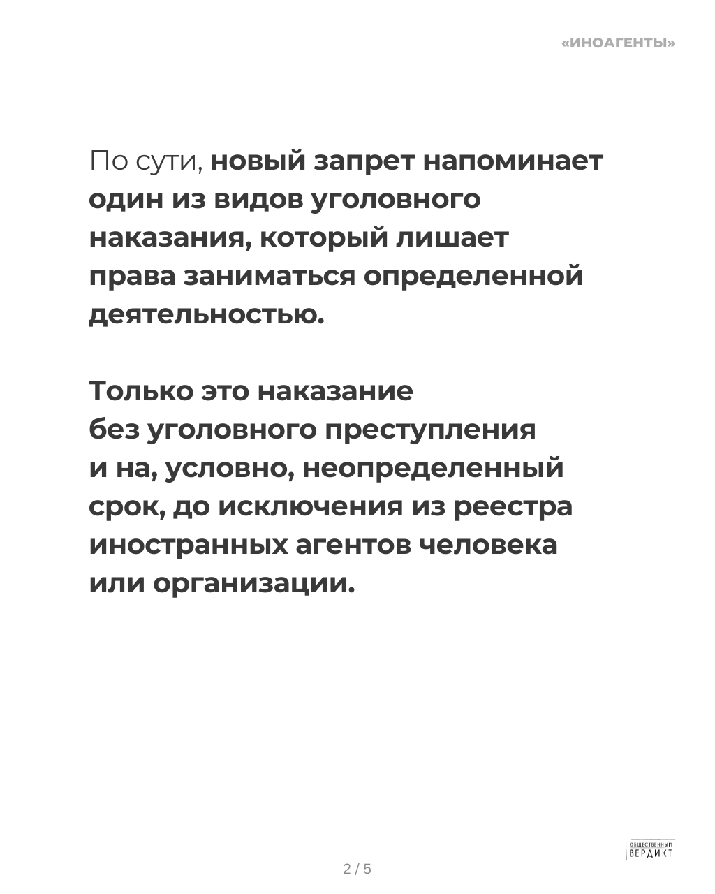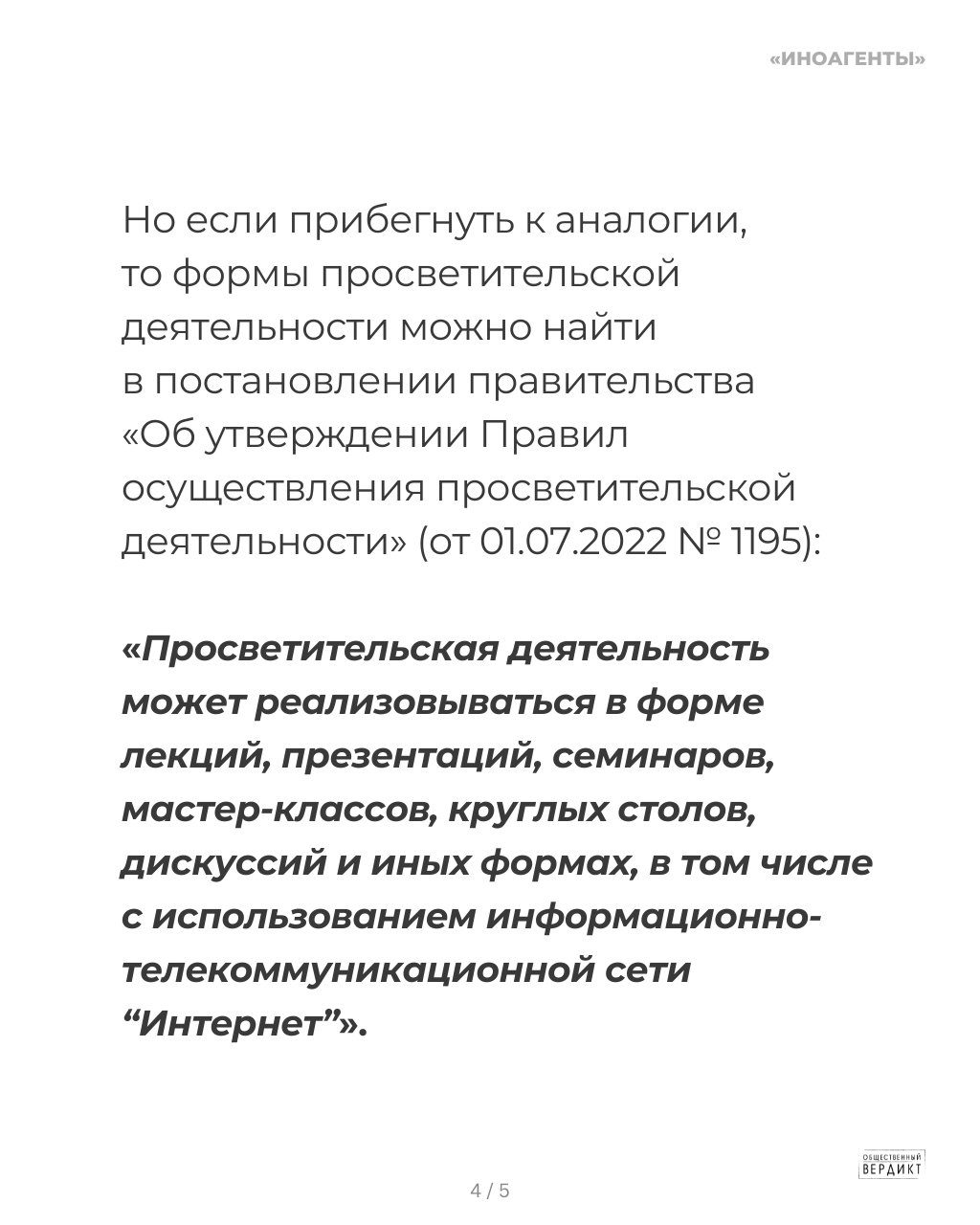 Принят закон, запрещающий «иностранным агентам» осуществлять просветительскую и образовательную деятельность. По нашему праву, запрет на просвещение — это вид уголовного наказания, который назначается приговором суда, признавшим человека виновным в преступлении. Теперь такой запрет по умолчанию касается всех без исключения носителей статуса «иноагента», выдается сразу и вообще вне какого-либо преступления.