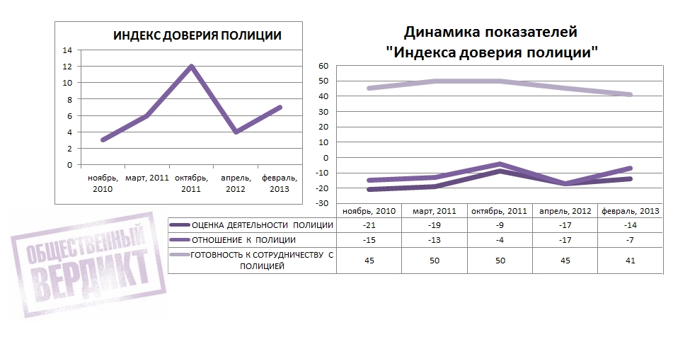 Индекс оценки деятельности полиции, который складывается из ответов граждан на вопросы об удовлетворенности работой полиции в их городе или районе, а также оценок способности полиции защитить от преступности, по состоянию на 1 марта равен «-14» пунктам, что несколько выше, чем год назад, в апреле 2012 года, однако по прежнему находится в отрицательных значениях. Уровень индекса отношения полиции, измеряемый исходя из ответов на вопросы о том, доверяют ли граждане полицейским, и какие чувства вызывают полицейские, равен «-7» пунктам. Индекс готовности сотрудничать с полицией, который отражает позицию по вопросам «должны ли граждане помогать полиции в ее работе», «готовы ли вызывать полицию, если они стали свидетелями ограбления», а также готовности давать свидетельские показания, находится в положительной части шкалы и равен «41» пункту.