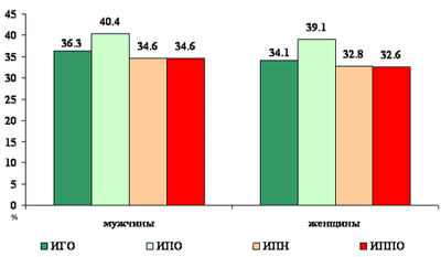 Распределение значений Индекса “ПРОИЗВОЛА ПРАВООХРАНИТЕЛЬНЫХ ОРГАНОВ” (ИППО) и его составляющих по полу. % от числа опрошенных