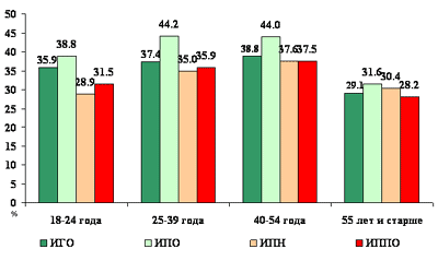 Распределение значений Индекса “ПРОИЗВОЛА ПРАВООХРАНИТЕЛЬНЫХ ОРГАНОВ” (ИППО) и его составляющих по возрасту. % от числа опрошенных