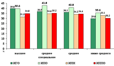 Распределение значения Индекса “ПРОИЗВОЛА ПРАВООХРАНИТЕЛЬНЫХ ОРГАНОВ” (ИППО) и его составляющих по уровню образования. % от числа опрошенных