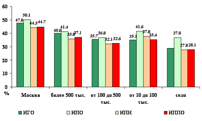Распределение значения Индекса “ПРОИЗВОЛА ПРАВООХРАНИТЕЛЬНЫХ ОРГАНОВ” (ИППО) и его составляющих по типу населенного пункта. % от числа опрошенных