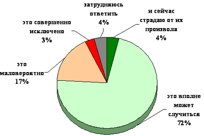 Распределение ответов на вопрос: “МОЖЕТЕ ЛИ ВЫ ИЛИ ВАШИ БЛИЗКИЕ ПОСТРАДАТЬ ОТ ПРОИЗВОЛА ПРАВООХРАНИТЕЛЬНЫХ ОРГАНОВ?” % от числа ответивших