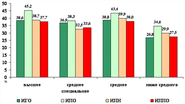 Распределение значения Индекса “ПРОИЗВОЛА ПРАВООХРАНИТЕЛЬНЫХ ОРГАНОВ” (ИППО) и его составляющих по уровню образования. % от числа опрошенных