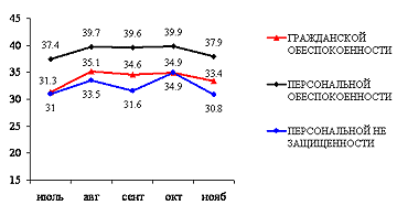 Значения ИНДЕКСОВ ГРАЖДАНСКОЙ, И ПЕРСОНАЛЬНОЙ ОБЕСПОКОЕННОСТИ, ПЕРСОНАЛЬНОЙ НЕ ЗАЩИЩЕННОСТИ, июль-ноябрь 2004 г.