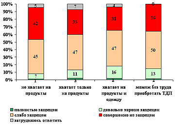Распределение ответов на вопрос: “НАСКОЛЬКО ВЫ ЛИЧНО ЧУВСТВУЕТЕ СЕБЯ ЗАЩИЩЕННЫМ(-ОЙ) ОТ ПРОИЗВОЛА ПРАВООХРАНИТЕЛЬНЫХ ОРГАНОВ?” по потребительским группам. % от числа ответивших