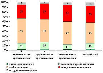Распределение ответов на вопрос: “НАСКОЛЬКО ВЫ ЛИЧНО ЧУВСТВУЕТЕ СЕБЯ ЗАЩИЩЕННЫМ(-ОЙ) ОТ ПРОИЗВОЛА ПРАВООХРАНИТЕЛЬНЫХ ОРГАНОВ?” по социальным группам (по самоопределению). % от числа ответивших