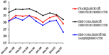Значения ИНДЕКСОВ ГРАЖДАНСКОЙ, И ПЕРСОНАЛЬНОЙ ОБЕСПОКОЕННОСТИ, ПЕРСОНАЛЬНОЙ НЕ ЗАЩИЩЕННОСТИ, июль 2004 г. - март 2005 г.