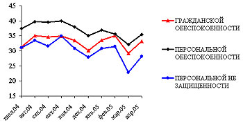 Значения ИНДЕКСОВ ГРАЖДАНСКОЙ, И ПЕРСОНАЛЬНОЙ ОБЕСПОКОЕННОСТИ, ПЕРСОНАЛЬНОЙ НЕ ЗАЩИЩЕННОСТИ, июль 2004 г. - апрель 2005 г.