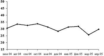 Значения индекса ПРОИЗВОЛА ПРАВООХРАНИТЕЛЬНЫХ ОРГАНОВ, июль 2004 г. - апрель 2005 г.
