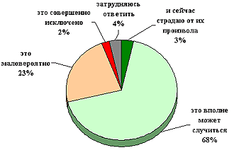 Распределение ответов на вопрос: “МОЖЕТЕ ЛИ ВЫ ИЛИ ВАШИ БЛИЗКИЕ ПОСТРАДАТЬ ОТ ПРОИЗВОЛА ПРАВООХРАНИТЕЛЬНЫХ ОРГАНОВ?” % от числа ответивших