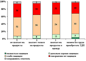 | Опрос проведен 19-22 августа 2005 г. | Всего | низкий (до 3000р) | средне-низкий (3000-5000р) | средне-высокий (5000-9000р) | высокий (свыше 9000р) | не хватает на продукты | хватает только на продукты | хватает на продукты и одежду | можем без труда приобретать ТДП | можем позволить себе многое |