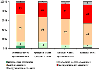 Распределение ответов на вопрос: “НАСКОЛЬКО ВЫ ЛИЧНО ЧУВСТВУЕТЕ СЕБЯ ЗАЩИЩЕННЫМ(-ОЙ) ОТ ПРОИЗВОЛА ПРАВООХРАНИТЕЛЬНЫХ ОРГАНОВ?” по социальным группам (по самоопределению). % от числа ответивших