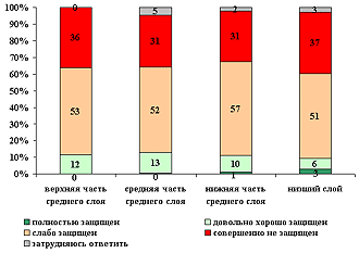 Распределение ответов на вопрос: “НАСКОЛЬКО ВЫ ЛИЧНО ЧУВСТВУЕТЕ СЕБЯ ЗАЩИЩЕННЫМ(-ОЙ) ОТ ПРОИЗВОЛА ПРАВООХРАНИТЕЛЬНЫХ ОРГАНОВ?” по социальным группам (по самоопределению). % от числа ответивших