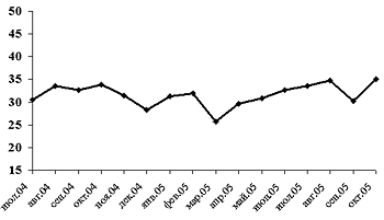 Значения индекса ПРОИЗВОЛА ПРАВООХРАНИТЕЛЬНЫХ ОРГАНОВ, июль 2004 г. - октябрь 2005 г.