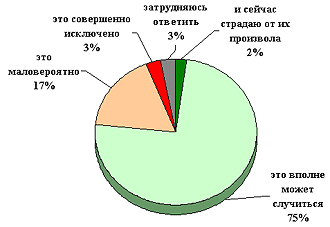Распределение ответов на вопрос: “МОЖЕТЕ ЛИ ВЫ ИЛИ ВАШИ БЛИЗКИЕ ПОСТРАДАТЬ ОТ ПРОИЗВОЛА ПРАВООХРАНИТЕЛЬНЫХ ОРГАНОВ?” % от числа ответивших