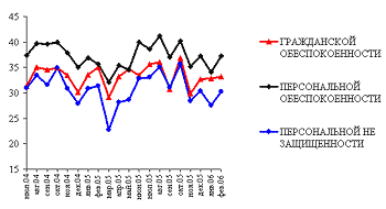Значения ИНДЕКСОВ ГРАЖДАНСКОЙ, И ПЕРСОНАЛЬНОЙ ОБЕСПОКОЕННОСТИ, ПЕРСОНАЛЬНОЙ НЕ ЗАЩИЩЕННОСТИ, июль 2004 г. - февраль 2006 г.