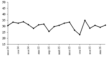Значения индекса ПРОИЗВОЛА ПРАВООХРАНИТЕЛЬНЫХ ОРГАНОВ, июль 2004 г. - февраль 2006 г.
