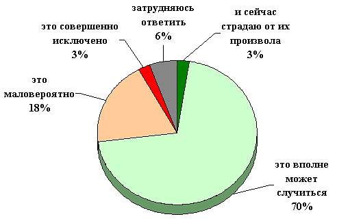 Распределение ответов на вопрос: “МОЖЕТЕ ЛИ ВЫ ИЛИ ВАШИ БЛИЗКИЕ ПОСТРАДАТЬ ОТ ПРОИЗВОЛА ПРАВООХРАНИТЕЛЬНЫХ ОРГАНОВ?” % от числа ответивших