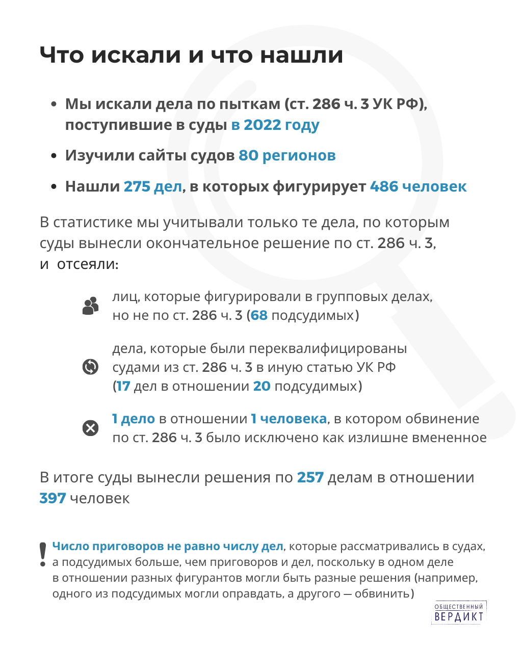Мы искали и анализировали информацию об уголовных делах по части 3 статьи 286 УК РФ (превышение должностных полномочий с применением насилия) в 80 регионах России. Эта единственная статья, которая пока используется для привлечения к ответственности за пытки и жестокое обращение. В следующем году мы надеемся увидеть судебную практику по новой статье — части 4 статьи 286 — превышение должностных полномочий с применением пыток. Эту новую статью мы критикуем тут.