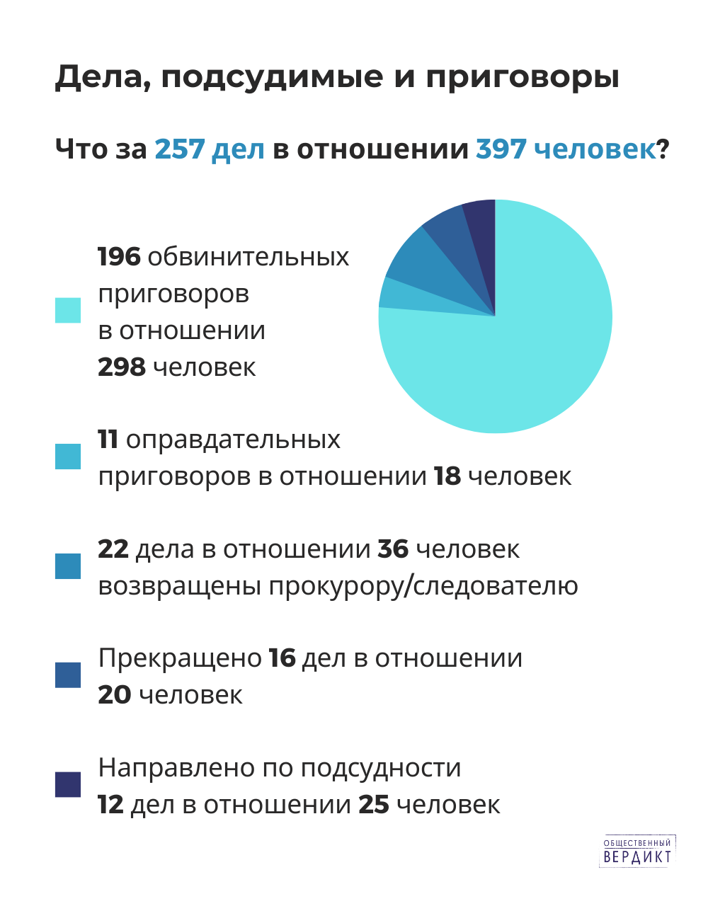 Мы выбирали те дела, по которым в 2022 году были вынесены судебные решения (приговоры, постановления о возвращении дела прокурору/следователю и пр.).