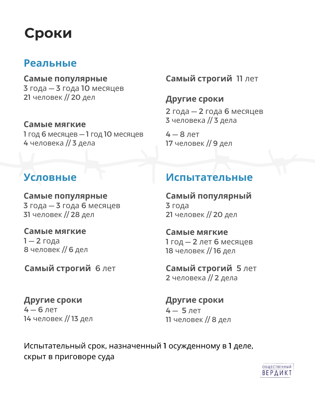 2) Условных приговоров больше, чем приговоров с реальным лишением свободы. Пытки — тяжкое преступление, нашим законодательством определяется как преступление против государственной власти, т.к. такое преступление подрывает основы верховенства права и самой государственной власти. В международном праве пытки — преступление, которое не имеет сроков давности, что само по себе указывает на значение запрета пыток как фундаментального права. Несмотря на это, в России сохраняется практика условного наказания.