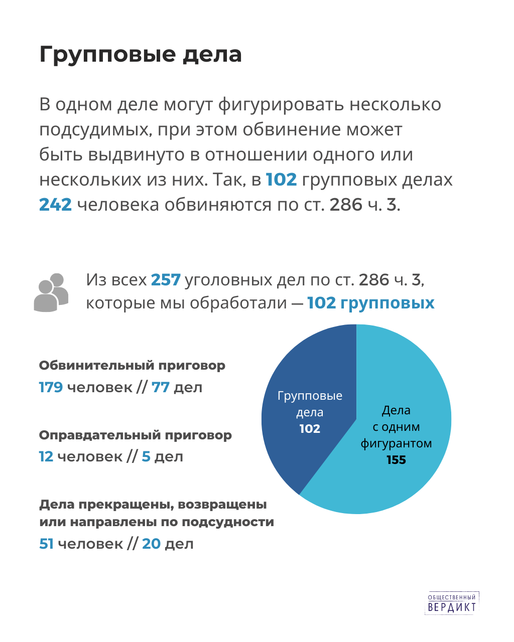 В некоторых делах суды переквалифицировали часть 3 статьи 286 на часть 1 статьи 286 (Совершение должностным лицом действий, явно выходящих за пределы его полномочий и повлекших существенное нарушение прав и законных интересов граждан или организаций либо охраняемых законом интересов общества или государства), либо на иные статьи Уголовного кодекса. Практически половина из найденных дел – групповые, в каждом из них участвуют от двух до 20 человек. Однако не все из них обвиняются по части 3 статьи 286 УК РФ, и не все являются должностными лицами. Посмотрев наши карточки, вы заметите, что где-то речь идет о делах, а где-то — о решениях судов (судебных актах, приговорах). Это связано с тем, что количество судебных актов, как правило, не равно количеству дел, которые рассматривались в судах, а количество подсудимых часто больше, чем количество судебных актов и количество дел. Например, в одном деле могут участвовать сразу несколько человек, при этом одного из подсудимых оправдали, а другого — обвинили. Либо в отношении одного подсудимого обвинительное заключение вернули прокурору или следователю, а в отношении других — вынесли обвинительный приговор. Либо в отношении всех подсудимых вынесли одно решение.