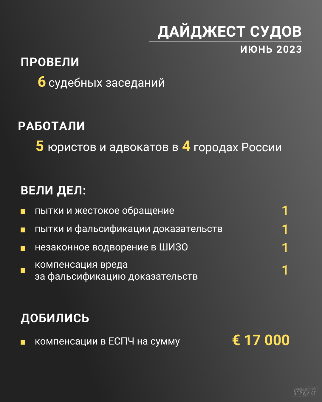 В июне ЕСПЧ присудил 17 000 евро компенсации морального вреда активистам из Москвы, Перми и Санкт-Петербурга, защиту которых поддерживал «Общественный вердикт». Речь идет о постановлениях - «Пухов и другие против России» (Applications nos. 59975/13 and 25 others) и «Сафронов и другие против России» (Applications nos. 55881/17 and 27 others).В России наши доверители были наказаны штрафами в размере от 10 000 до 150 000 рублей за участие в акциях в поддержку Алексея Навального, за честные выборы в Мосгордуму и акции «Он нам не царь». В ЕСПЧ активисты пожаловались на несоразмерные санкции, принятые против них как участников публичных мероприятий, ссылаясь на статью 11 Конвенции (свобода собраний и объединений), а также на нарушение статей 5 и 6 Конвенции (право на свободу и личную неприкосновенность и право на справедливое судебное разбирательство).